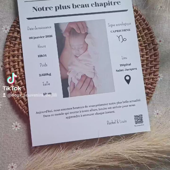 Annoncez la nouvelle la plus importante de votre vie avec originalité ! Loin des faire-part traditionnels, notre Gazette de Naissance transforme l’arrivée de votre enfant en un événement historique. Conçue comme la "Une" d'un journal de prestige, elle immortalise chaque détail de ce jour unique pour en faire un souvenir impérissable.